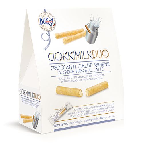 Rolled wafer straws filled with milk cream, wrapped two by two. 10 twin packs