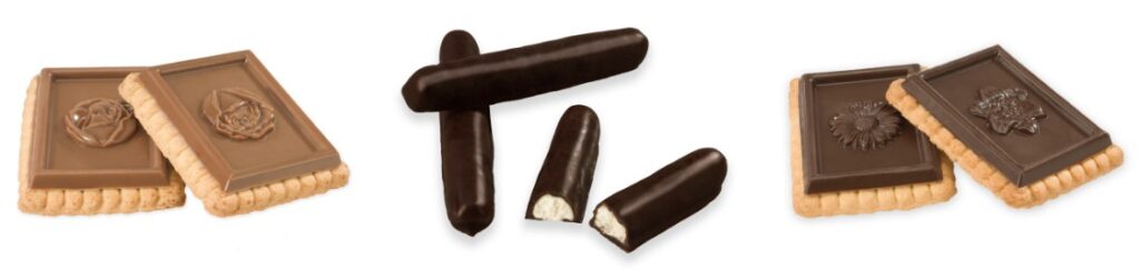Darüber hinaus ist das Täfeln mit ein- oder zweifarbigen Schokoladen und die Herstellung von Doppelkeksen und Cerealien eine besondere Expertise.