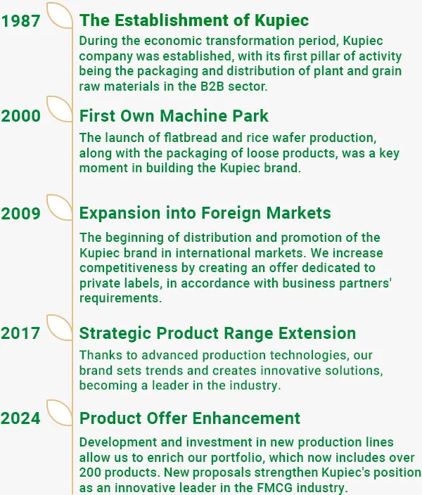 We are a Polish family company with over 37 years of experience in the market. Currently, the second generation is actively participating in the business. For over 15 years, Kupiec products have been available in international markets, including the USA, Canada, Australia, Germany, Great Britain, Netherlands, Scandinavia, Brazil, Chile, Peru, Hungary, and Middle Eastern countries. Over the last three decades, we have become experts in healthy food production. Kupiec specializes in producing gluten-free rice and corn cakes with additives and chocolate coating, cereal cookies, flatbreads, instant porridge, as well as confectionery of cereal products, groats and rice, legumes, and confectionery additives.