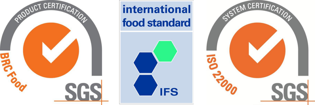 In response to the specific commercial challenges of the industry, we integrated the requirements of the global and international food safety standards of IFS since 2006 as well as of BRC since 2007 in our quality management system. The effectiveness of our work is recognized by continuous, “higher level” certificates issued by the certification body.