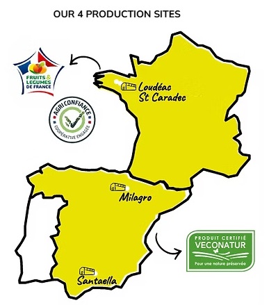All our products are frozen and packaged either in France , in our factories in Loudéac and St Caradec in Brittany, or in Spain in our factories in Santaëlla and Milagro.