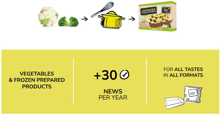 Organic single vegetables, mixes, purees, soups, gratins, stir-fries, cooked vegetables… “Fruits & Légumes de France” certified depending on the vegetable