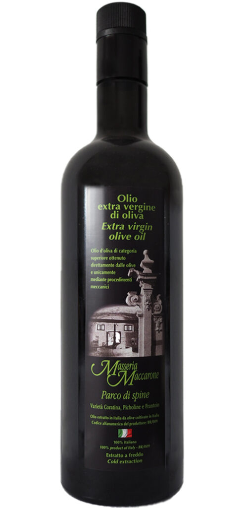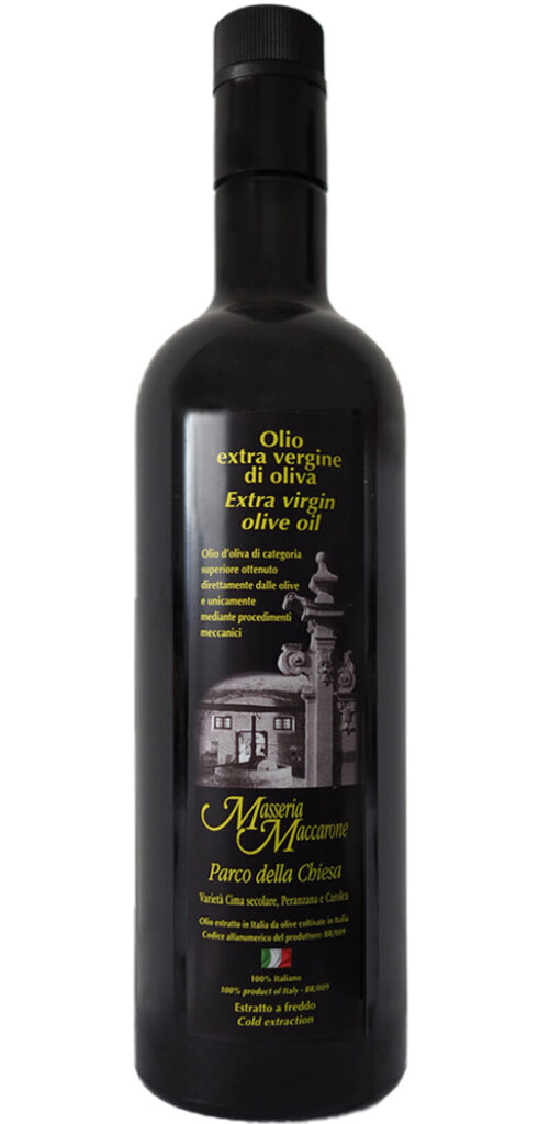 Masseria Maccarone is one of the few producers to practice organic olive cultivation. The cultivation is overseen by technicians from the Intensive Production Consortium. Cultivation includes olive varieties such as Ogliarola from ancient trees and Leccino; Coratina; Cima di Melfi; Carolea; Picholine; Frantoio; Sant’Agostina; Nociaria; Frangivanta; Cima di Mola; Cellian and other indigenous varieties from recent olive tree plantings.