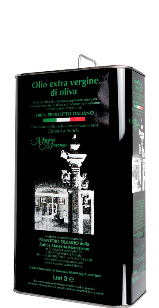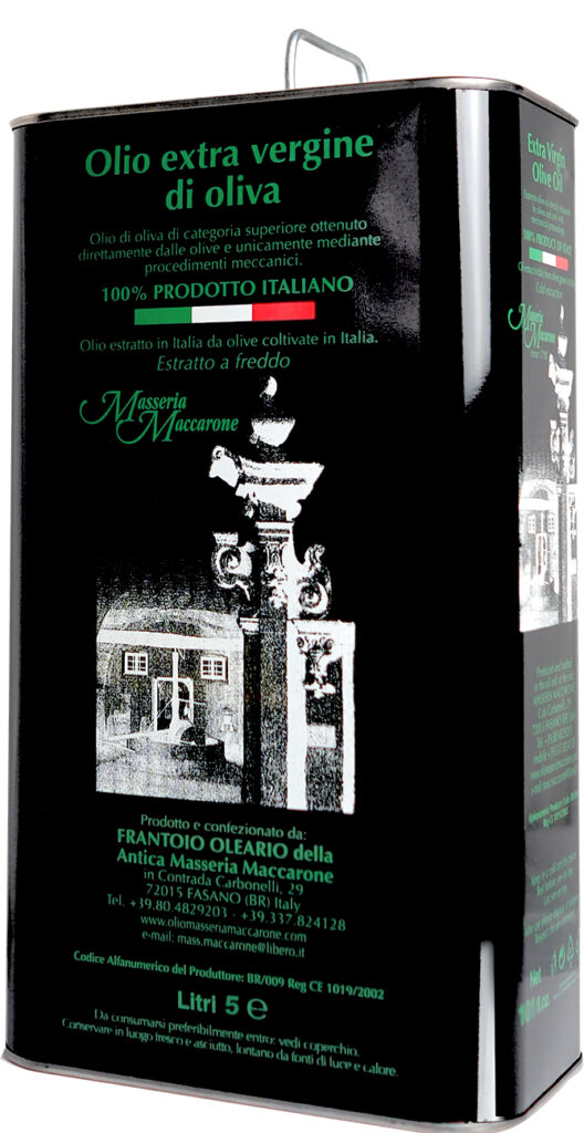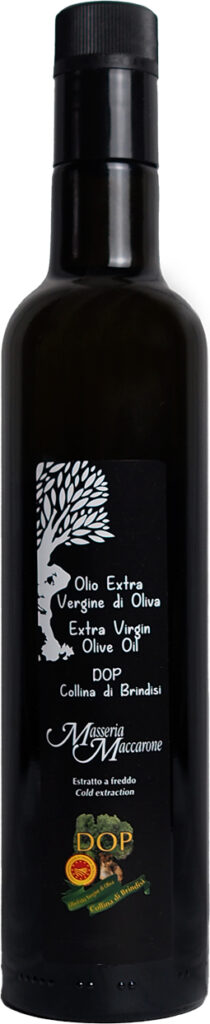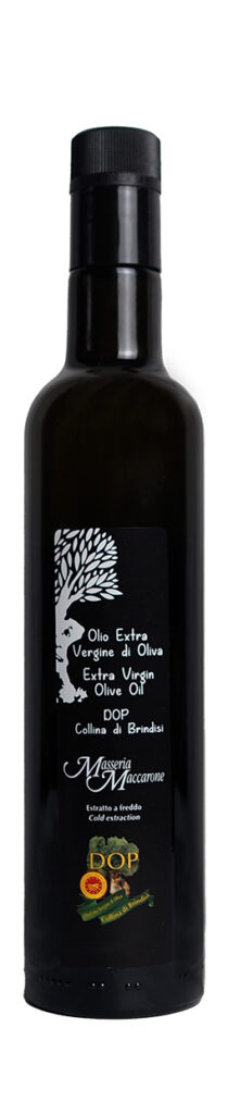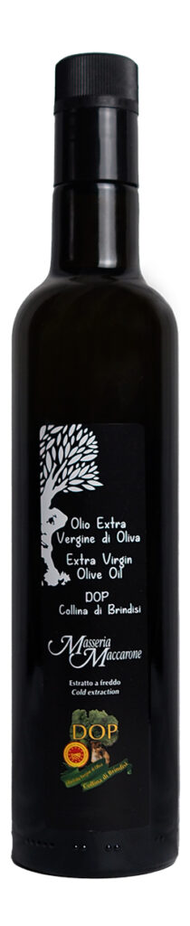 This is a Masseria Maccarone extra-virgin olive oil renowned for its outstanding flavour. The D.O.P. certification (Denominazione di Origine Protetta) ensures that the extra virgin olive oil is produced from Masseria Maccarone olives and that every stage of production including bottling or canning is within the olive oil mill of Masseria Maccarone. The D.O.P. is certified by an external certification consortium with laboratory and panel tasting test facilities, which guarantees for consumers the extra virgin olive oil is of the highest quality and is totally produced from Masseria Maccarone olives. Testing procedures are controlled by BIOAGRICERT and are guaranteed by the Ministry of Agriculture and Forestry under Article 10 of Reg. EEC 2081/92.
