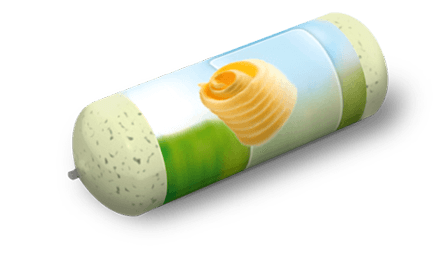Our rolls of butter are packaged in a transparent plastic complex closed at both ends by metal bands. A self-adhesive label completes the packaging. This packaging option is very flexible in terms of weight. By adapting the roll length, an infinite range of different weights is available. In western Europe, this packaging is often used for aromatised butters (garlic and fine herbs, etc.).